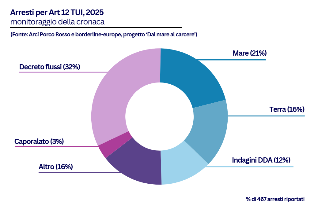 Nel 2025, secondo il nostro monitoraggio, più di 250 articoli di cronaca hanno riportato un totale di 467 arresti per il reato di “facilitazione dell’immigrazione irregolare” previsto all’art. 12 del TUI.* Anche se questa cifra non equivalesse al numero di persone che sono state effettivamente portate in carcere, soffermarci su questi dati può darci un’idea di come la criminalizzazione per art.12 sia cambiata negli ultimi anni.